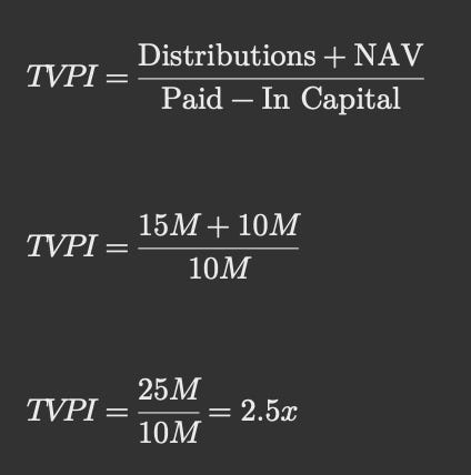 A TVPI of 2.5x means that for every $1 the LP originally invested, they now have $2.50 worth of value. Some of this is in paid-out cash and some in still-held investments.